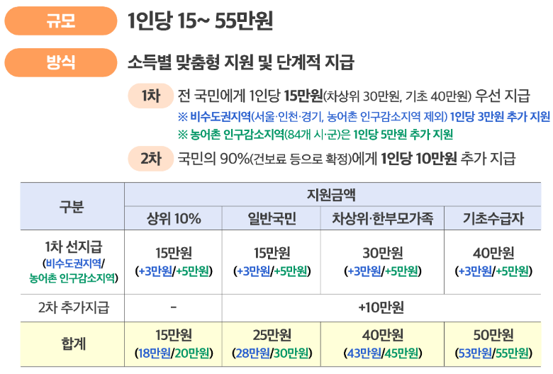 지급 금액은 대상별 유형에 따라 차등 제공되며, [상위 10%] 15만원 [일반국민] 25만원, [차상위, 한부모가족] 40만원, [기초수급자] 50만원 까지 지원됩니다. 금액 산정은 신청 시점의 주민등록상 정보와 소득 기준에 따라 자동 적용됩니다. 💰