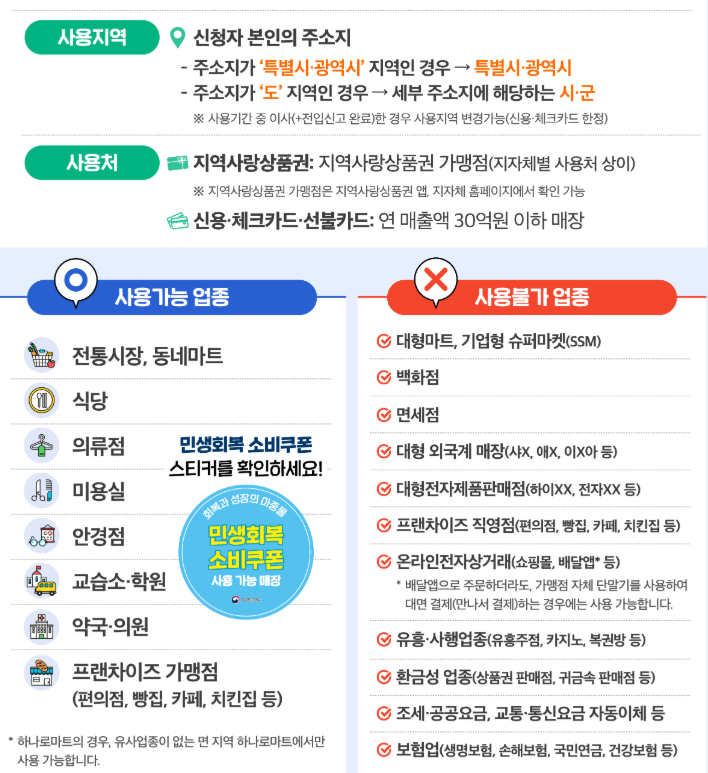 사용할수 있는 지역은 신청자 본인의 주소지입니다. 사용 할 수 있는 곳은 지역사랑상품권 가맹점 (지자체별 사용처 상이) 과 신용, 체크카드, 선불카드 연 매출액 30억원 이하 매장에서 사용 가능합니다.